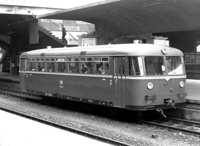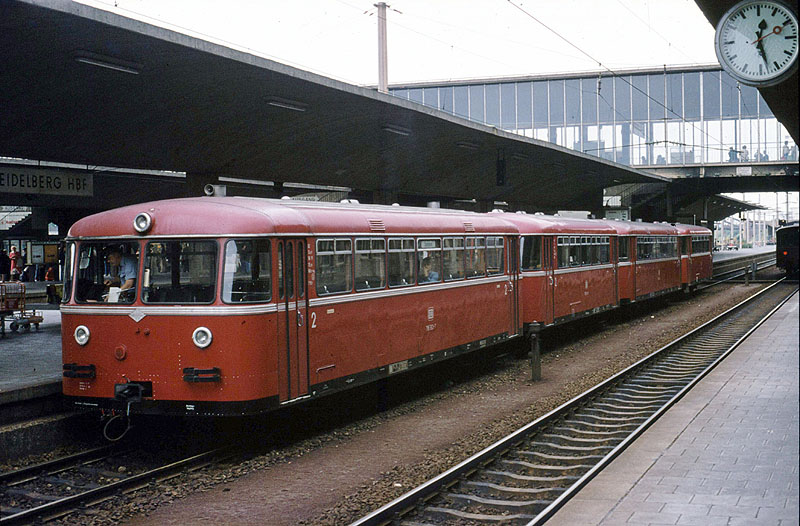 | 795 553 mit zwei Beiwagen und einem weiteren VT am 08.08.1978 in Heidelberg Hbf. |