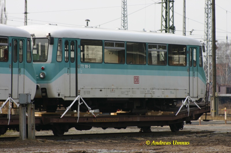 | 772 109 wurde in Stendal auf einen Tiefladewagen zum Abtransport verladen. Aufnahme vom 15.03.2005. |