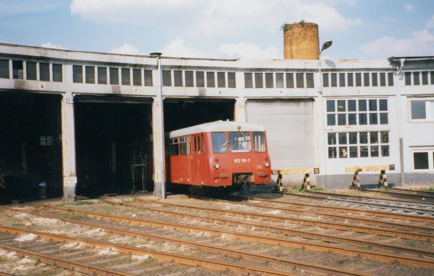 | 972 701 guckt im Juli 1996 aus dem Schuppentor im Bw Leipzig Hbf Süd. |