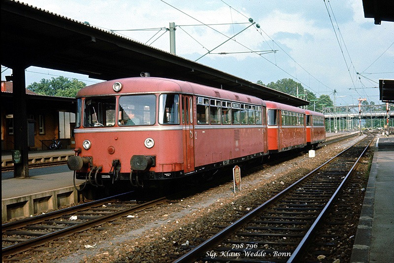 Eine dreiteilige VT-VB-VS-Garnitur mit 798 796 an der Spitze im Bf. Lindau am 18.07.1978.