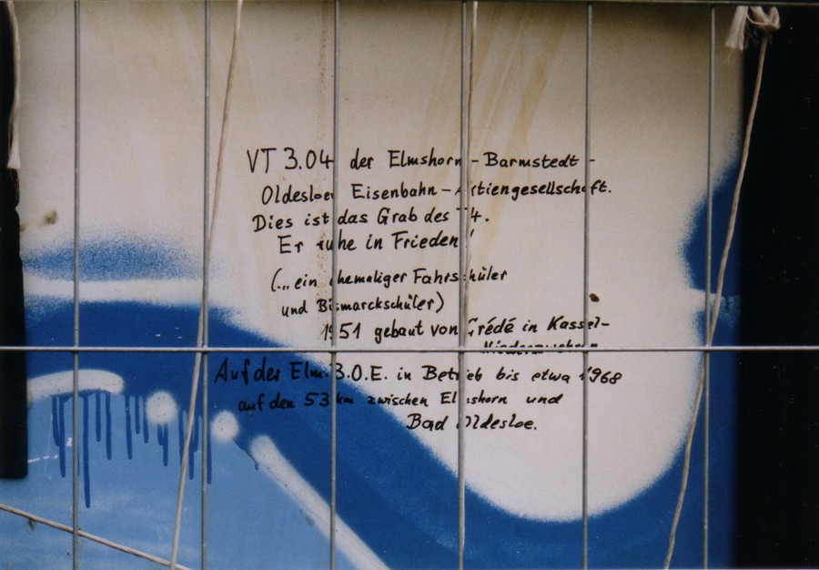 Bemerkungen: Fahrzeug stand für einige Jahre in einer Werkhalle in Barmstedt untergestellt. Nach Abriss wurde der Wagen verplant und steht nun auf dem Anschlussgleis zum Werk in der Nähe des Bf. Barmstedt. Dieses Gleis ist jedoch nicht mehr am AKN-Netz angeschlossen. - Fahrzeug wurde Anfang 2006 in Barmstedt zerlegt.