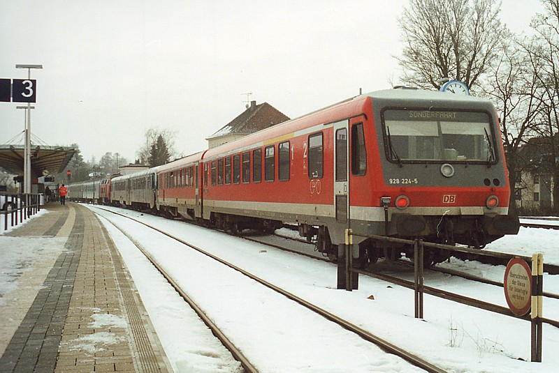 Alles was Räder hat, war im Januar 2001 zu den Ski-Weltcup-Tagen in Willingen im Einsatz. Hier 928 224, ein weiterer 628er sowie eine 218 mit vier Silberlingen im Bf. Korbach.