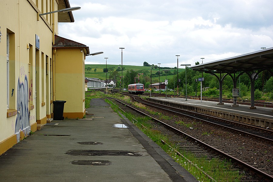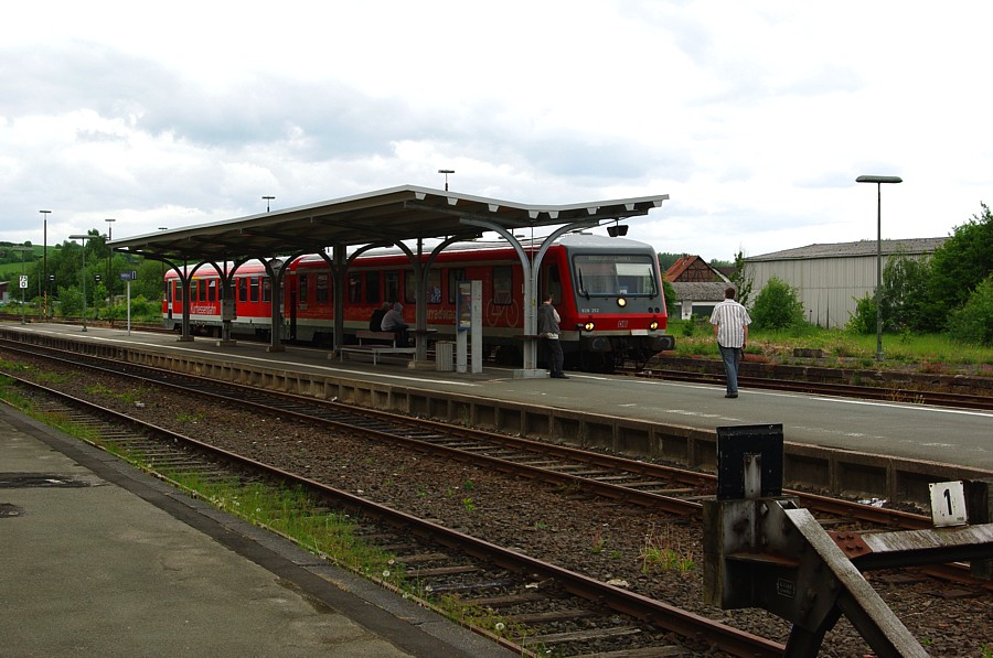 928 252 fährt von Marburg kommend in den Endbahnhof Frankenberg/Eder ein.