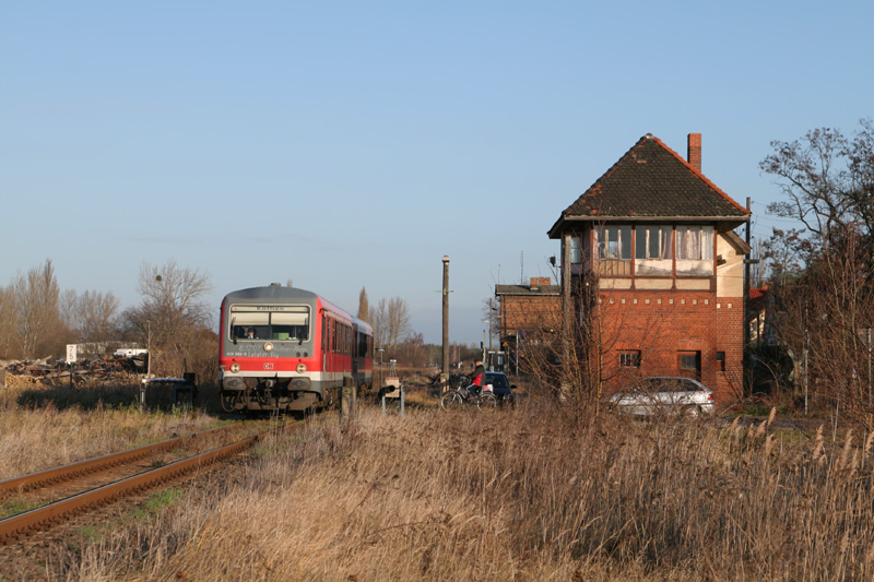 | Am Tag vor der Einstellung des Personenverkehrs auf der Strecke Aken-Köthen war 628 602 unterwegs. Hier am 08.12.2007 am Stellwerk von rebbichau. |