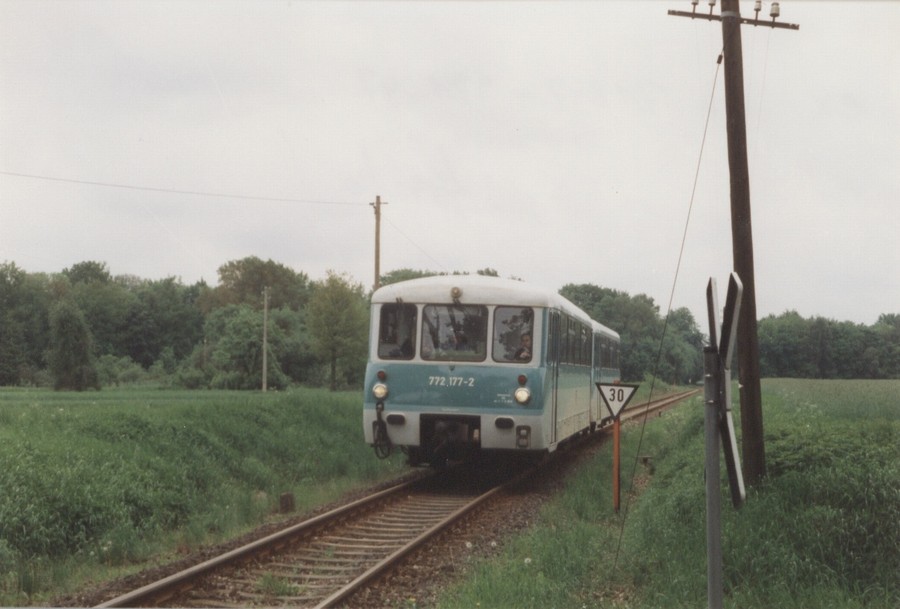 772 177 mit Steuerwagen auf der Strecke Putlitz - Pritzwalk bei Laaske 1996.
